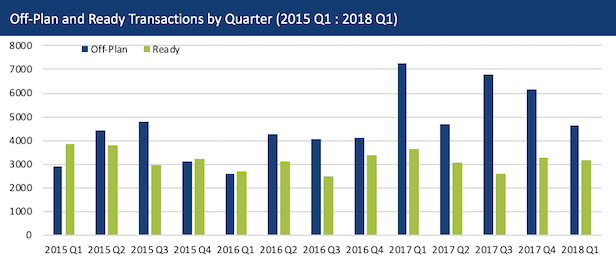 Since 2017 Q3 till date ready transactions have risen by 24%, while off-plan transactions have fallen by 32% in the same time period. In 2017 off-plan dominated the market landscape accounting for 60-70% of all sales. However, in the first quarter of 2018, we have witnessed a reversal where ready sales account for nearly half of the overall activity. This trend is expected to continue and was widely expected as off plan incentives reached their theoretical maximum and the price gap between ready and off plan prices reached unsustainably high levels and have begun the process of mean reversion.