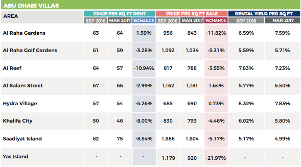 Al Hydra Village offers the best rental yields in Abu Dhabi with 7.8% just ahead of Al Raha Gardens but both are down compared to 6 months ago. All popular Abu Dhabi villa communities continue to offer investors 5%+.