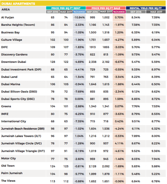 Dubai continues to be a multi- tiered market where the most desirable locations offer the worst rental yields, while the best yields are found in emerging communities surrounding by desert and mass construction. Discovery Gardens (9.5%), JVT (9.4%) & DIP (9%) continue to offer world leading rental yields. Apartment yields in International City (8.8%), Dubai Sports City (8.7%), IMPZ (8.6%) DSO (8.6%) & Dubai Land (8.4%), JLT (8%) & Motor City (7.9%) continue to be excellent.